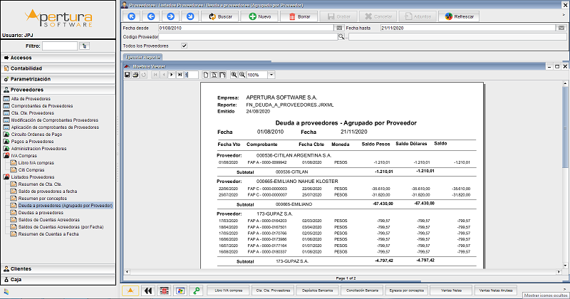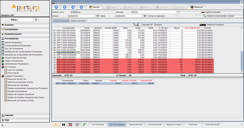Permite realizar ABM de Proveedores, la carga de comprobantes de compra, manejar cuentas corrientes acreedoras, generar el libro I.V.A. y los asientos contables automáticos respectivos. Establecer fechas de vencimiento, manejar pagos a cuenta, seguir un circuito de Órdenes de Pago, manejar circuitos de cheques y pagar los comprobantes con todos los medios de pago definidos. Generar reportes varios.