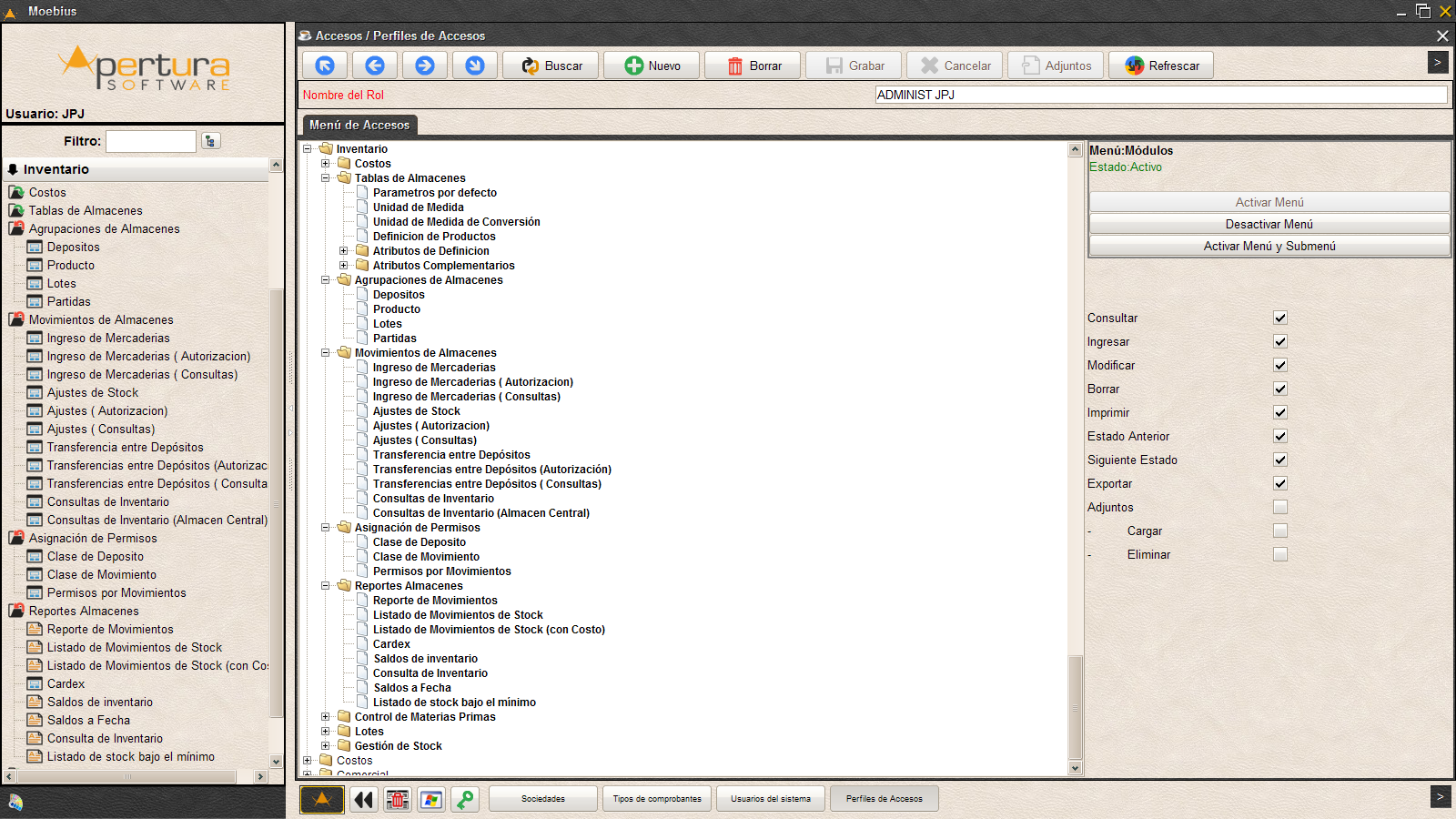 Este módulo permite gestionar las altas, bajas y modificaciones de los usuarios del sistema y la creación de los roles de acceso al mismo. El acceso por roles permite configurar distintos tipos de acceso logrando al mismo tiempo un alto grado de seguridad y flexibilidad.