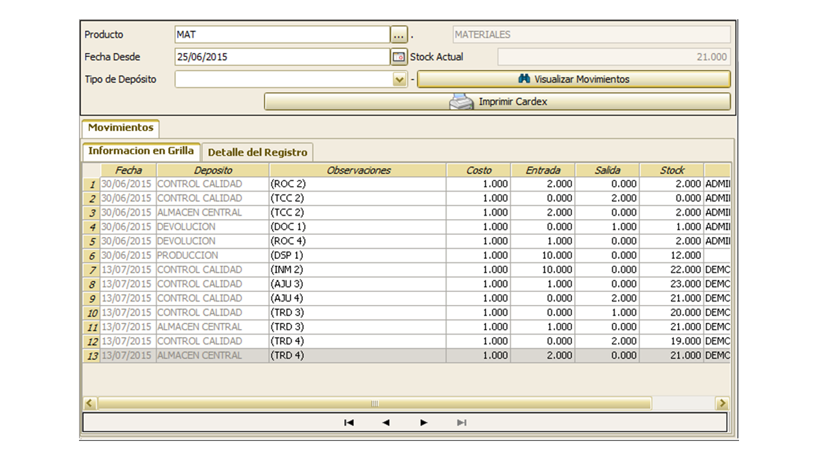 Este módulo permite realizar agrupaciones del stock en el sistema por: depósitos, productos, lotes y partidas. Permite realizar asignación de permisos a los movimientos de stock, por usuario, depósitos, clases de depósitos y circuitos automáticos o con autorización. Desde la pantalla de movimientos de almacenes podrá realizar la generación de los movimientos de Stock. Podra generar reportes para análisis de gestión. Se destaca entre estos el Reporte de Stock mínimo, saldo de inventario y el Cardex de productos. Se incorporó la función para generar despachos con Remitos a través de Egresos de Stock.